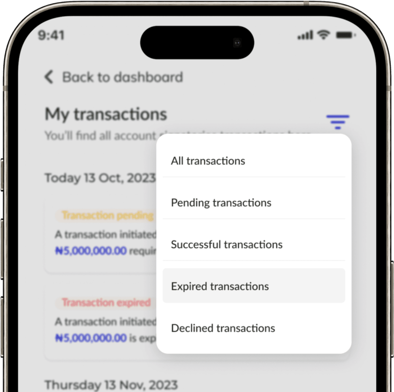 Signatories can easily identify and filter transactions by status.